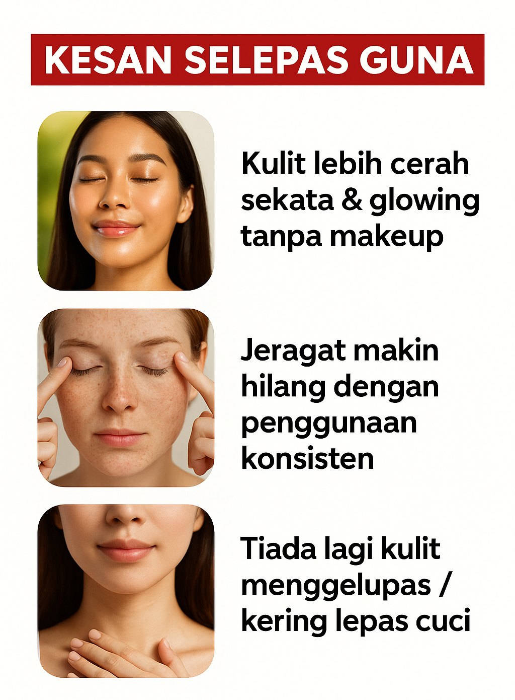 KETIGA : Anda bagi peluang untuk cuba set Glow Raya sekarang. Amalkan setiap pagi, malam sampai anda dapat lihat kulit wajah semakin sihat. Nampak muda dari biasa. Kengkawan akan mula perasan dan akan tanya. Produk apa yang anda guna.